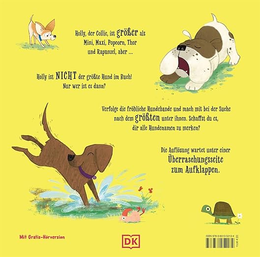 Wer ist der größte Hund in diesem Buch? Vielleicht Mini, die kleine Chihuahua-Dame, die sich so gerne in dicke Kissen kuschelt, oder Holly, der Collie, die am liebsten dem eigenen Schwanz hinterherjagt? Jeder Hund ist etwas ganz Besonderes, aber nur einer kann der größte sein! Mit jedem Umblättern wird es spannender: Wer schaut am Ende unter die Ausklappseite und findet des Rätsels Lösung?
