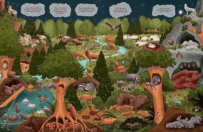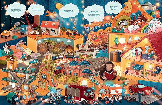 Jetzt ist bald Schlafenszeit! Du darfst dir aber noch ein Wimmelbild aussuchen und wir erfinden gemeinsam eine schöne Gute-Nacht-Geschichte dazu. Welche Seite wirst du heute auswählen? Besuchen wir den Bauernhof, die Stadt, den Spielzeugladen, das Märchenland oder den Wald? Lass uns herausfinden, was die Bewohner dort machen, wenn es Nacht wird. Erzählen wir die Geschichte wieder gleich wie gestern oder ganz neu? Du findest kleine Anregungen in den Wölkchen am Himmel.