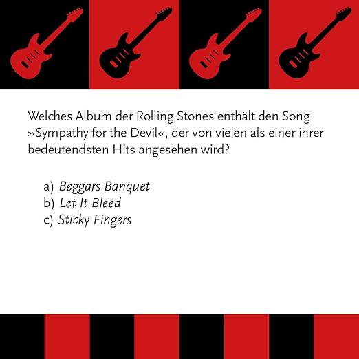 Bist du ein wahrer Fan der legendären Rockband? Teste dein Wissen und tauche ein in die Welt der Rolling Stones mit unserem unterhaltsamen und herausfordernden Quizspiel. Von den Anfängen bis zu den größten Hits – hier gibt es keine Täuschung, nur echtes Stones-Wissen! 66 Fragen und Fakten: Fordere deine Freunde heraus und zeige, dass du der ultimative Stones-Experte bist.